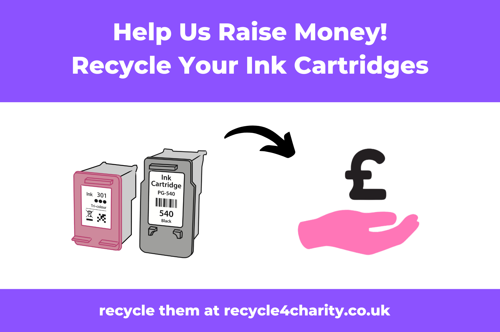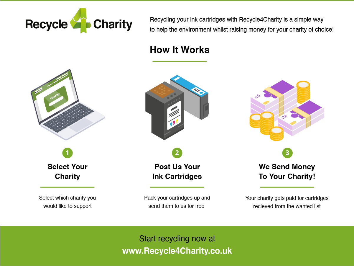 You can recycle your printer ink cartridges by dropping them into Rainbow Corner when we are open or signing up here https://www.recycle4charity.co.uk/Register/C157570 and sending them directly to Recycle4Charity using a freepost label.